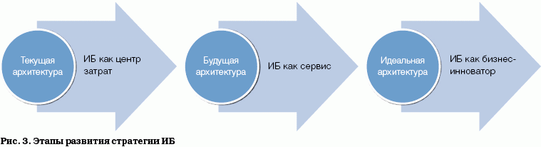 Архитектура ИБ отражает ее состояние в определенный момент времени. И хотя сложно себе представить полностью застывшую систему, в которой не происходит никаких изменений, все же архитектура играет большую роль в деятельности любой службы ИБ. Как из текущего состояния перейти в новое, более совершенное и соответствующее целям бизнеса? Для этого существует стратегия, то есть направление движения для достижения поставленных целей (см. рис. 2).