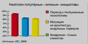 Разумеется, основной причиной внедрения «зеленых» технологий является экономия электроэнергии. Например, в США это соображение стало основной движущей силой 77% проектов. В краткосрочной перспективе основным приоритетом руководство компаний называет внедрение систем измерения энергопотребления и управления им. Это действительно больной вопрос для многих организаций: даже при достижении позитивных результатов измерить реальную экономию способны далеко не все. По данным IDC, список наиболее популярных «зеленых» инициатив, планируемых к внедрению в течение ближайшего года, включает переход к безбумажным технологиям, миграцию на архитектуру модульных серверов в ЦОД, а также внедрение «тонких клиентов», потребляющих в восемь раз меньше энергии по сравнению с обычными рабочими станциями.