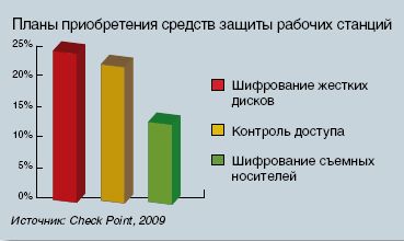 Почти половина респондентов указала, что в течение года планирует приобрести приложения для защиты рабочих станций; самыми популярными оказались средства шифрования содержимого дисков (24%), контроль доступа к сети (22%) и утилиты для шифрования съемных носителей (13%). Среди уже внедренных приложений были названы антивирусные пакеты, средства борьбы со шпионскими программами и сетевые экраны.