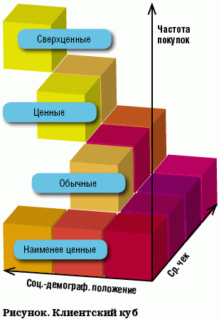 Сегментация клиентов хотя бы по этим трем показателям поможет построить так называемый клиентский куб (см. рисунок), который окажет неоценимую помощь в понимании структуры клиентов компании и основных направлений развития клиентской базы.
