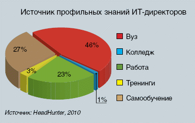 Как показало исследование, проведенное компанией HeadНunter, специальные профессиональные знания во время обучения в вузах получили меньше половины нынешних ИТ-директоров. Самостоятельно осваивали азы специальности 27% опрошенных, в ходе работы обучались 23% специалистов, 3% посещали тренинги, а 1% ограничился обучением в среднем специальном учебном заведении. Лидерами по выпуску ИТ-директоров среди столичных вузов являются МГТУ им. Н. Э. Баумана, МИФИ, МГУ, МАИ и МФТИ. Что любопытно, половина опрошенных директоров никогда не получала дополнительного образования по специальности. У оставшихся респондентов самым популярным выбором становились сертификаты Microsoft. Затем идут программы Cisco, Oracle и IBM. Около половины ИТ-директоров не имеет дополнительного образования и в бизнес-сфере, 25% обучались по программам управления проектами PMI, а степень MBA получили лишь 13% ИТ-руководителей.