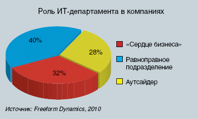 Согласно результатам опроса, проведенного Freeform Dynamics, 32% ИТ-директоров полагают, что ИТ являются в их компании «сердцем бизнеса» — инструментом реализации инноваций — и приносят огромную пользу бизнесу. Почти 40% респондентов отметили, что ИТ-департамент «стоит в одном ряду» с бизнес-подразделениями. Лишь около 28% признались, что роль ИТ-отдела считается топ-менеджментом менее значимой, а средства на него выделяются по остаточному принципу. Очевидно, ИТ-департамент в большинстве компаний все же связан с бизнесом и имеет для него существенную ценность. Однако доля организаций, где ИТ-отдел считается исключительно затратным подразделением, по-прежнему довольно высока.