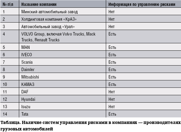 Кризис высветил ключевую проблему — несовершенство управления рисками во всех аспектах: концептуальных, методологических, управленческих, технологических, организационных. Например, согласно нашему анализу, у 47% компаний — лидеров производства грузовых автомобилей в мире — отсутствуют системы управления рисками (см. таблицу), что говорит о недостаточном внимании их владельцев и менеджмента к сохранению бизнеса, а также о склонности к краткосрочным деловым стратегиям и патерналистским настроениям, особенно в России. Широко известной иллюстрацией является судьба АвтоВАЗа.