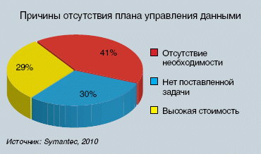 Ситуацию осложняет и то, что в ряде компаний ИТ-менеджеры вообще не видят необходимости в плане управления данными. Кроме того, 30% заявили, что бизнес-руководством не было озвучено такой задачи, а 29% назвали причиной отсутствия плана его высокую стоимость.