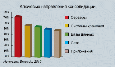 Три из четырех европейских компаний в течение ближайшего года планируют консолидацию своей ИТ-инфраструктуры. Причинами инвестиций в эту область является повышение производительности сети, упрощение управления и, в конечном счете, увеличение эффективности бизнеса. Результаты исследования, проведенного Brocade, показали, что 76% предприятий рассматривают консолидацию ИТ в числе трех самых приоритетных вопросов на ближайший год. При этом консолидация опережает по значимости такие направления, как виртуализация и информационная безопасность. Говоря об основных направлениях консолидации, 70% называют существующие серверы, 56% — системы хранения, а 54% — базы данных.