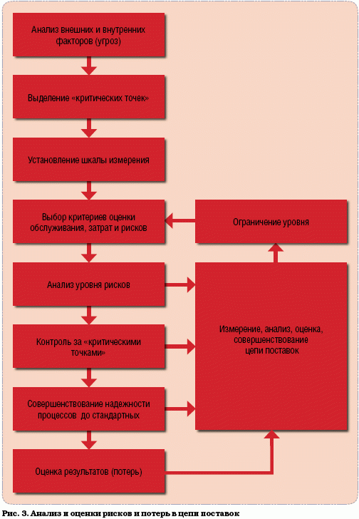 Важной особенностью, определяющей актуальность систем менеджмента безопасности, будет нацеленность на снижение потерь, особенно при транспортировке грузов и их защите от различных рисков. Систематически осуществляемые анализ и оценки направлены на выявление недостатков в процессах, происходящих в цепях поставок, и позволяют снизить общие издержки и потери (см. рис. 3).