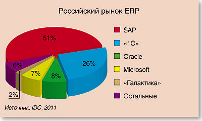 Лидером российского рынка ERP в 2010 году осталась компания SAP, доля которой составила 51%. За ней следуют «1С» и Oracle, а четвертое и пятое места достались Microsoft Dynamics и отечественной «Галактике». По итогам года наиболее прибыльными отраслями для поставщиков ERP остаются непрерывное производство, розничная торговля и дискретное производство, далее следуют энергетика и банковский сектор.