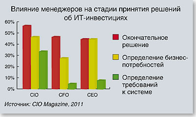 Согласно собственным исследованиям CIO Magazine, проведенным в 2011 году, ИТ-департаменты подчиняются финансовым директорам вдвое реже. Более того, ИТ-директора заявляют, что влияют на процесс приобретения ИТ-продуктов и услуг на каждой его стадии.