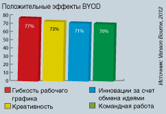 В целом респонденты назвали четыре положительных изменения для сотрудников: увеличение гибкости рабочего графика, повышение креативности, новаторство и более активное взаимодействие с коллегами. Кроме того, компании, следующие стратегии BYOD, отмечают повышение производительности труда, сокращение времени реагирования на запросы клиентов и улучшенную операционную эффективность.