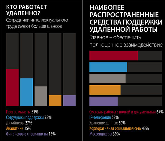 Подавляющее большинство удаленных работников – профессионалы, для которых самодисциплина не является проблемой. В первую очередь это программисты, сотрудники служб поддержки клиентов, дизайнеры, аналитики и сотрудники финансового департамента. По данным опроса, контроль рабочего дня дистанционных сотрудников осуществляется в 59% компаний, но более половины опрошенных руководителей признались, что это лишь формальность.