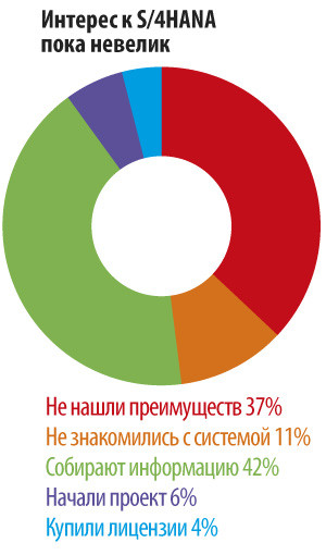 Примерно 37% респондентов заявили, что пока не нашли преимуществ, которые бы S/4HANA дала им по сравнению с традиционной SAP ERP, 11% еще не знакомились с новой системой, а 42% только собирают информацию о ней. Многие посетовали на то, что сама SAP недостаточно рассказывает о функционале и преимуществах своего нового решения, о модели лицензирования и о том, что требуется, чтобы перейти на S/4HANA.