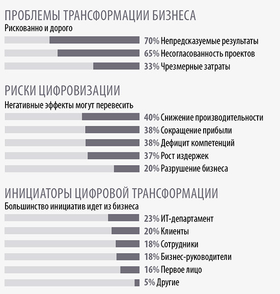 Однако аналитики полагают, что на деле оптимизм бизнеса в отношении цифровых преобразований выглядит по большей части бравадой. Только одна из четырех компаний действительно уверена в принимаемых решениях в области цифровых преобразований, тогда как две компании из трех признают, что подобные проекты, реализуемые у них, скорее, являются авантюрой. Более того, треть бизнес-руководителей оценивают затраты своей организации на цифровые проекты как чрезмерные.