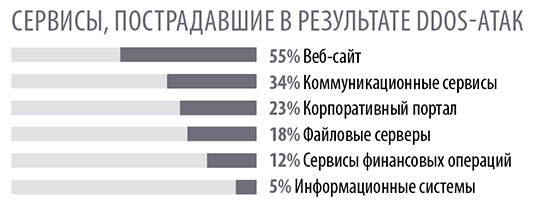 Атакующие старались вывести из строя не только сайт организации, хотя такая цель была в числе главных – 55% DDoS-атак были направлены именно на официальный веб-портал компании. Тем не менее треть инцидентов затронула коммуникационные сервисы (прежде всего почтовые серверы), а в 23% случаев пострадали страницы, предназначенные для клиентов компании. 18% атак были нацелены на файловые серверы, и еще 12% – на сервисы для совершения финансовых операций.
