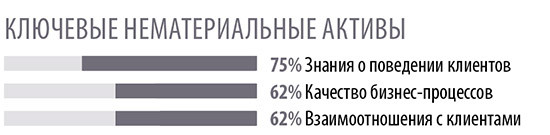 В исследовании, проведенном Chartered Global Management Accountant, утверждается, что необходимость оценить, какие преимущества для бизнеса несут нематериальные активы, с помощью ключевых показателей эффективности (KPI) будет только нарастать по мере распространения бизнес-моделей, активно использующих цифровые технологии. Важность нематериальных активов существенно выросла за последние несколько лет, и сегодня на их долю приходится 80% от общей акционерной стоимости компаний. Опрошенные респонденты считают, что основными факторами повышения эффективности и акционерной стоимости их компаний являются поведение потребителей (его отметили 75% респондентов), качество бизнес-процессов (62%) и взаимоотношения с клиентами (62%).