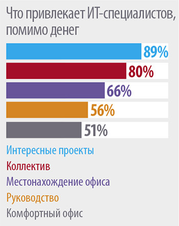 Ключевыми ценностями для ИТ-специалиста являются самореализация и возможность творчески подходить к решению задач. «Для многих решение сложных задач становится долгосрочными инвестициями в себя, происходит повышение рыночной капитализации благодаря накоплению опыта, навыков и знаний», – считает Александр Шахов, руководитель департамента «IT/Telecom и Media» кадрового агентства «Юнити». Нередко уникальный проект мотивирует специалистов больше, чем размер дохода, но сильно снижать планку не стоит – заработная плата должна быть в рыночных пределах.
