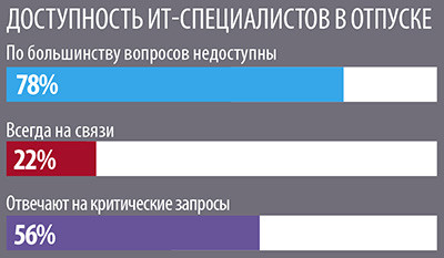 При этом наблюдаются две противоречивые тенденции. Например, многие имеют возможность полностью выключиться из рабочего процесса на время отпуска. 78% таких опрошенных заявили, что недоступны для рабочих звонков в этот период. Остальные же, напротив, остаются на связи и видят в этом только преимущества – они чувствуют себя спокойнее, если держат процессы под контролем даже в отпуске. Кроме того, 56% всегда отвечают на критические запросы и тем самым могут избежать чрезмерной загрузки по возвращении из отпуска.