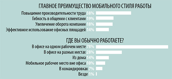 Главное преимущество мобильного стиля работы – более высокая производительность труда, которую отметили 38% респондентов. Кроме того, мобильные технологии позволяют повысить гибкость в общении с клиентами, увеличить оборот бизнеса, рациональнее использовать офисные площади.