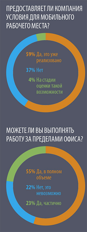 Сегодня рабочее место не ограничивается одним лишь рабочим столом в офисе, в стране уже становится нормой удаленная занятость. По данным Citrix, 78% сотрудников имеют возможность работать за пределами офиса и только 22% не могут работать удаленно, чаще всего это обусловлено спецификой их деятельности.
