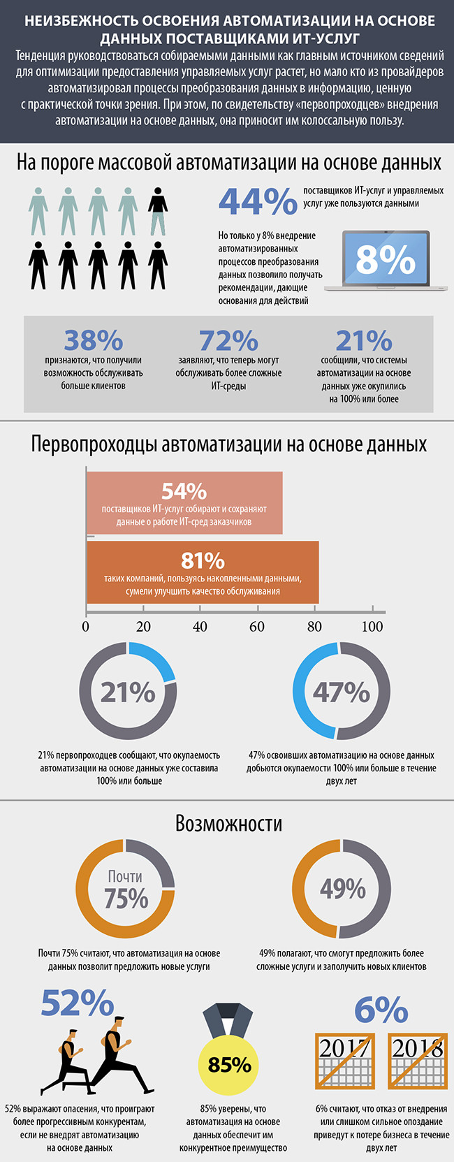 Сбором данных о работе систем клиентов занимаются 54% провайдеров ИТ-услуг, а 81% из них реализовали не только сбор, но и возможность проактивно действовать на основе собранных данных. И хотя далеко не все автоматизировали эти действия, преимущества автоматизации для многих уже стали очевидными. Из 92% провайдеров, пока не внедривших технологии автоматизации, почти 75% считают, что они позволят увеличить число оказываемых услуг, а 49% – что более качественные услуги позволят расширить бизнес. Кроме того, 85% рассчитывают на получение конкурентного превосходства, а 52% опасаются проиграть в конкуренции, если не внедрят технологии автоматизации. Наконец, 6% считают, что без этих технологий их компании просто разорятся в течение двух лет.