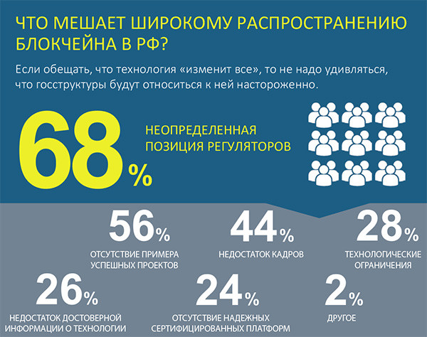 Недостатки, как известно, зачастую являются продолжением достоинств. Приверженцы блокчейна часто обещают коренную перестройку бизнес-процессов и контрактных отношений, а вот регулирующие органы настороженно относятся к этой технологии (а ближе к реальному внедрению станет весомым фактором и консерватизм руководства, о котором пока рано говорить). По крайней мере 68% респондентов считают именно неопределенность позиции регуляторов главным препятствием на пути внедрения блокчейна.