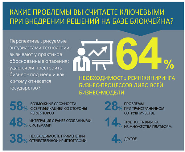 Если говорить о самом процессе внедрения блокчейн-системы, то наиболее существенных проблем стоит ожидать от переделки «под блокчейн» бизнес-процессов или даже всей бизнес-модели предприятия. Такие опасения высказали 64% опрошенных. Вторая по важности проблема связана с регулятором и заключается в сложностях с сертификацией (58%), третья – с технологиями (48%): блокчейн-систему придется интегрировать с другими решениями, и не вполне ясно, какие сложности возникнут при работе «гибрида».