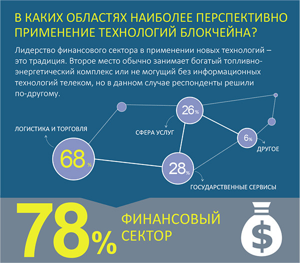 Наиболее востребован блокчейн, по мнению респондентов, будет в финансовой сфере, далее следуют логистика и торговля, государственные сервисы, сфера услуг. Сами они видят главную ценность блокчейна в том, что он позволит повысить прозрачность операций (68%) и исключить влияние человеческого фактора (60%). Впрочем, 60% опрошенных считают, что тех же результатов можно достичь с помощью других технологий. Не видит альтернативы блокчейну лишь каждый десятый.