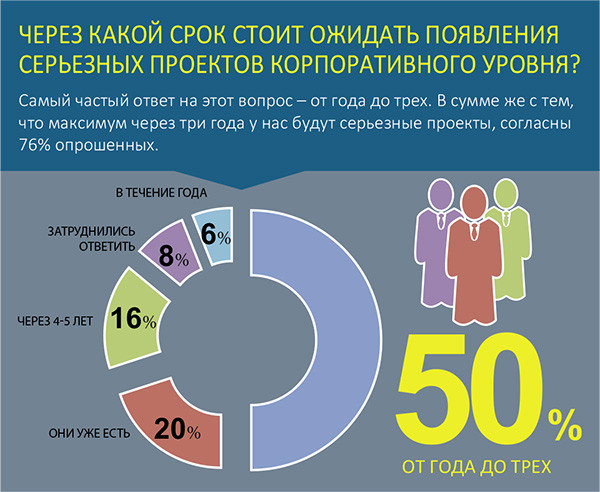 Если зарубежные аналитики полагают, что текущий год станет переломным, то отечественные респонденты относятся к такому прогнозу скептически. Лишь около четверти опрошенных считают, что серьезные корпоративные блокчейн-проекты в стране уже осуществлены или будут реализованы в этом году, наиболее часто высказывается мнение, что ждать их предстоит «от года до трех лет» (так ответили половина опрошенных).