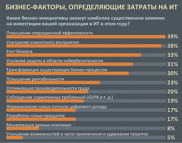 Соблюдение нормативных требований, таких как GDPR, идет рука об руку с инициативами в области безопасности: 19% респондентов считают эту бизнес-инициативу главной в 2018 году. И здесь, конечно, организации не могут позволить себе играть в догонялки.