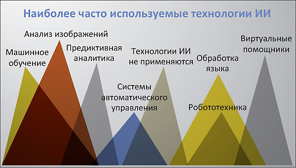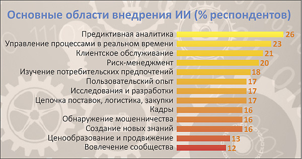 Компании наиболее часто используют ИИ для предсказательной аналитики, управления операциями в режиме реального времени, обслуживания клиентов и риск-менеджмента. Какова его наиболее популярная сфера применения, зависит от индустрии: респонденты из розничной торговли чаще указывают обслуживание клиентов (31% по сравнению с 21% в среднем по всем индустриям), а финансовый сектор — выявление мошеннических действий (25% к 16%).
