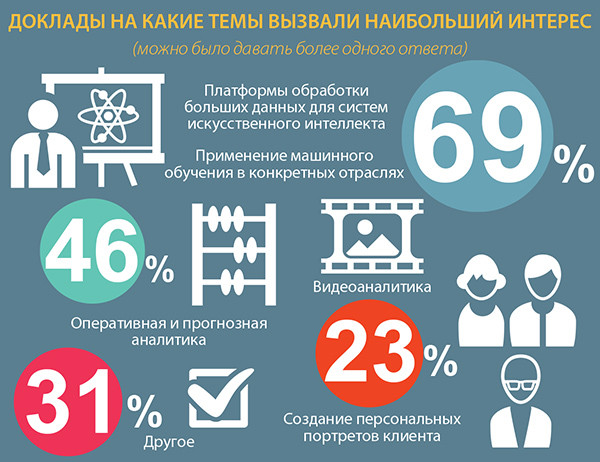 Наибольший интерес вызвали обработка больших данных и практические примеры успешного применения средств машинного обучения, особенно ценные для тех, кто только раздумывает над включением систем искусственного интеллекта в корпоративный ландшафт. Да и обладателям действующих решений полезно узнать о чужих экспериментах, ошибках и достижениях.