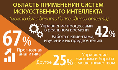 Почти у трети респондентов уже внедрены системы (31%), использующие искусственный интеллект. У остальных ведется изучение вопроса. Самые популярные направления (или будущего применения) — прогнозная аналитика, управление процессами в реальном времени и работа с лиентами (текущее обслуживание, изучение предпочтений).