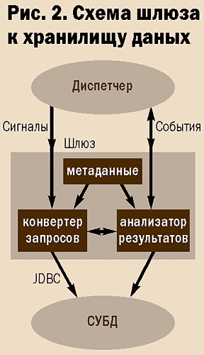 Система, основанная на Change Pump, может легко расширяться с помощью специальных шлюзов. Один из таких шлюзов используется и в РГНФ: это шлюз между Change Pump и базами данных, поддерживающими JDBC (рис. 2). Change Pump передает шлюзу все необходимые сообщения, задаваемые метаданными. Шлюз в соответствии со своими метаданными преобразует сообщения в JDBC-запросы и передает их в базу данных. Полученные результаты расшифровываются и могут породить новые запросы к базе данных или новые события для Change Pump.