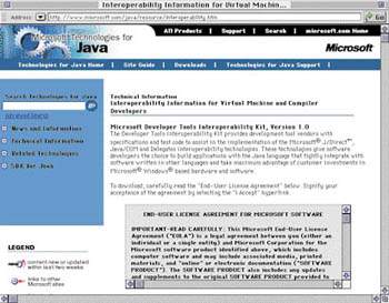 Памятуя о предстоящем судебном разбирательстве с обладателем патента на технологию Java — компанией Sun Microsystems, Microsoft весьма неохотно поставляет собственные обновленные варианты виртуальной машины Win32 JVM и компиляторов. Представители Sun считают, что действия конкурента являются прямым нарушением достигнутой ранее договоренности. По их словам, Microsoft может использовать лицензию как ей заблагорассудится, но при этом обязана следить за «чистотой» продуктов Java.