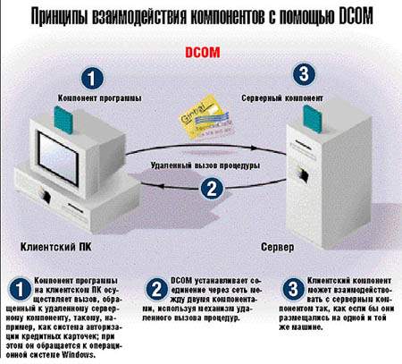 Определение Distributed Component Object Model (DCOM) — программная архитектура, разработанная компанией Microsoft для распределения приложений между несколькими компьютерами в сети. Программный компонент на одной из машин может использовать DCOM для передачи сообщения (его называют удаленным вызовом процедуры) к компоненту на другой машине. DCOM автоматически устанавливает соединение, передает сообщение и возвращает ответ удаленного компонента. |