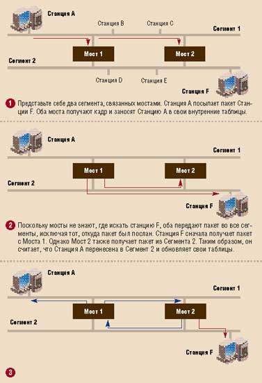 Мост 2 также передает пакет, который он сначала получил из Сегмента 1, в Сегмент 2. Станция F получает тот же самый пакет во второй раз — это уже потенциальная проблема. Мост 1 обнвруживает пакет, пришедший через Сегмент 2. Он обновляет свои таблицы, чтобы отобразить, что Станция A перенесена в Сегмент 2, и, поскольку по-прежнему не знает, где находится Станция F, передает пакет через Сегмент 1, замыкая тем самым цикл трафика.