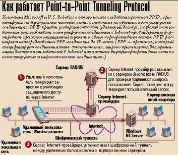 IPSec также поддерживает соединения между удаленными пользователями и корпоративными сетями. Аналогичным образом, Microsoft добавляет поддержку туннелирования между локальными сетями для протокола PPTP в своем Routing and Remote Access Server для операционной системы Windows NT Server 4.0.