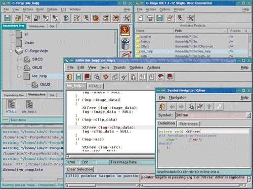C-Forge — мощная интегрированная среда разработки, помогающая программистам в создании качественных приложений и стоящая недорого. Почти каждый разработчик, несомненно, одобрит тот факт, что в состав интегрированной среды входят такие испытанные, распространяемые в исходных текстах внешние компоненты, как компилятор GNU C Compiler и отладчик Data Display Debugger.