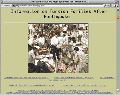 На странице Disaster Message Service (http://www.viexpo.com/dmstest/earth.html) была открыта доска объявлений, а на странице Turkish Families After Earthquake (http://turkishfamily.homepage.com) размещены поименные списки раненых и погибших, а также доска объявлений для пофамильного поиска пропавших. И хотя большинство сообщений приходило от тех, кто искал своих близких, некоторые письма сообщали о найденных людях. Вот пример такого сообщения: «Все члены семьи Фирол живы, дома их уничтожены. Звонили из Халидера в 2:10 по калифорнийскому времени. Все живы и находятся в горах. Молимся за всех в Турции».