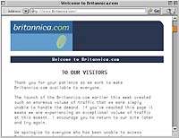 …и сразу же закрылась. Уже через несколько часов после запуска бесплатной Web-службы Encyclopaedia Britannica доступ к ее узлу был перекрыт. Часть из посетителей вовсе не смогла попасть на узел, часть не могла получить доступ к функции поиска. Компания объясняет проблемы «временными перегрузками». На Web-узле размещено письмо главы компании с извинениями, в котором говорится, что Britannica.com стала жертвой собственного успеха, поскольку ее серверы не смогли справиться с наплывом посетителей.