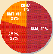 | Распределение по стандартам рынка сотовой связи России. Участники опроса весьма оптимистичны в расчете доли, которую CDMA сможет получить на рынке российской сотовой связи к середине 2000 года. Коллективный прогноз дал значение 9,9%, что означает, по сути дела, выраженное ожидание от CDMA бурного роста в оставшиеся девять месяцев. Ведь сегодня доля CDMA не превышает 2% среди всех сотовых систем России. |