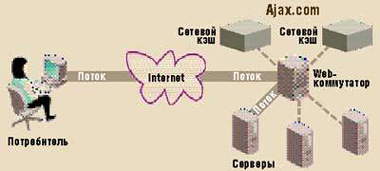 | Принцип действия Web-коммутации. Клиент запрашивает ресурс по URL, Web-коммутатор получает запрос, анализирует URL и http-заголовок, выбирая наиболее подходящий сервер и «соединяет» клиентский и серверный потоки. Блок управления потоком передается коммутат |