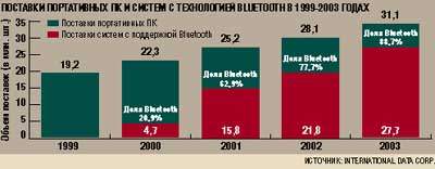 | Ожидается, что массовый переход на портативные ПК с поддержкой Bluetooth начнется в первых месяцах 2000 года. По прогнозу International Data Corp., к 2003 году около 90% ноутбуков, продаваемых |