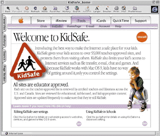 Джобс также представил ряд ориентированных на конечного пользователя Internet-инструментов, предназначенных для работы вместе с серверной и клиентской платформами Macintosh. ITools, iCard и iReview — новые службы на Apple.com, которые, к примеру, будут включать в себя базу данных с узлами, разрешенными для показа детям. Вместо того чтобы отфильтровывать нежелательные узлы, как действует большая часть современного ПО защиты, база данных будет содержать только допустимые узлы. Сейчас в базе данных насчитывается около 50 тыс. узлов, проверенных и одобренных учителями и библиотекарями.