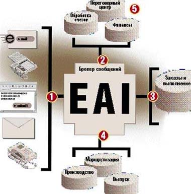 Определение: Интеграция корпоративных приложений (enterprise application integration — EAI) — подход, предусматривающий связывание приложений, приобретенных или разработанных внутри самой компании, с тем чтобы они наилучшим образом поддерживали бизнес-процессы. EAI предоставляет пользователям инструментальные средства для моделирования бизнес-процессов и связи этих приложений с промежуточным ПО, которое может обеспечить взаимодействие с другими приложениями за счет обмена сообщениями