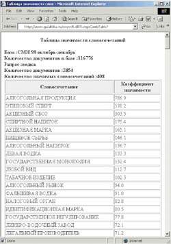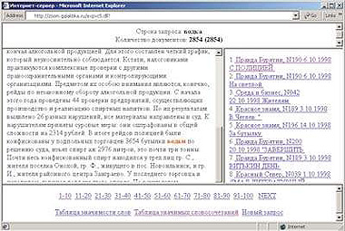 | Рассмотрим пример автоматического определения уточняющих тем. Поиск в примере выполнялся по базе СМИ за октябрь — декабрь 1998 года. Количество документов в базе — 116776. В ответ на запрос «водка» поисковая система нашла 2854 документа, в которых было вы выделено 408 значимых словосочетания. Справа для примера приведены первые десять словосочетаний. |