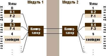 В пределах узла база данных распределена по серверным платформам, которые поддерживаются на физически независимых модулях. Клиентские компьютеры и серверы базы данных объединены по принципу кластера — через коммутаторы, которые, в свою очередь, соединены друг с другом. Что же касается записей базы данных, каждая имеет свою резервную копию, а оригинал и полученные копии разбиты на фрагменты и распределены для хранения в независимых участках памяти на основании алгоритма хэширования. На рисунке основные записи обозначены как «О», резервные — как «Р». Каждому набору данных выделяется свой объем оперативной памяти и свое дисковое пространство.