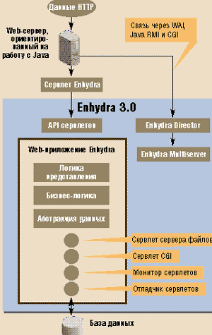 Передача данных через EnhydraJava-приложение Enhydra может работать на Web-сервере как автономное Java-приложение или как встроенный механизм сервлетов Enhydra — Enhydra Multiserver. Enhydra автоматически выполняет балансировку нагрузки между несколькими машинами. |