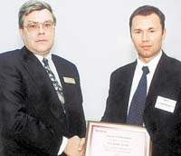 | Михаил Павлычев (слева) вручает Виталию Мосееву («Классика CIS») сертификат, которого нелегко было добиться |