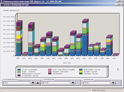 Результаты анализа визуализируются (в том числе и средствами трехмерной графики) на клиентских ПК. Общий объем детализированных данных в системе достигает 150 Гбайт, суммарных таблиц — 14 Гбайт, информации в 34 многомерных кубах в витринах данных — 22 Гбайт. Ежесуточно информационное хранилище пополняется 80-100 тыс. записей, их подгрузка занимает 20-25 минут. Судя по откликам пользователей, система оказалась очень полезным подспорьем в их работе. В настоящее время информационное хранилище обслуживает около полутора сотен пользователей. Предполагается, что к концу года их число возрастет до 250 за счет подключения служб региональных подразделений МПС.