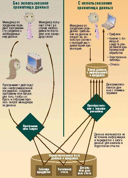 Принимая критически важные решения в области бизнеса, менеджеры обычно полагаются на анализ данных. В приведенных ниже примерах менеджеру необходимо проанализировать данные о продажах. При наличии хранилища данных (справа) менеджер по продажам может обратиться с запросом и самостоятельно оценить полученную информацию. В противном случае (слева) для извлечения данных придется обратиться за помощью к программисту.
